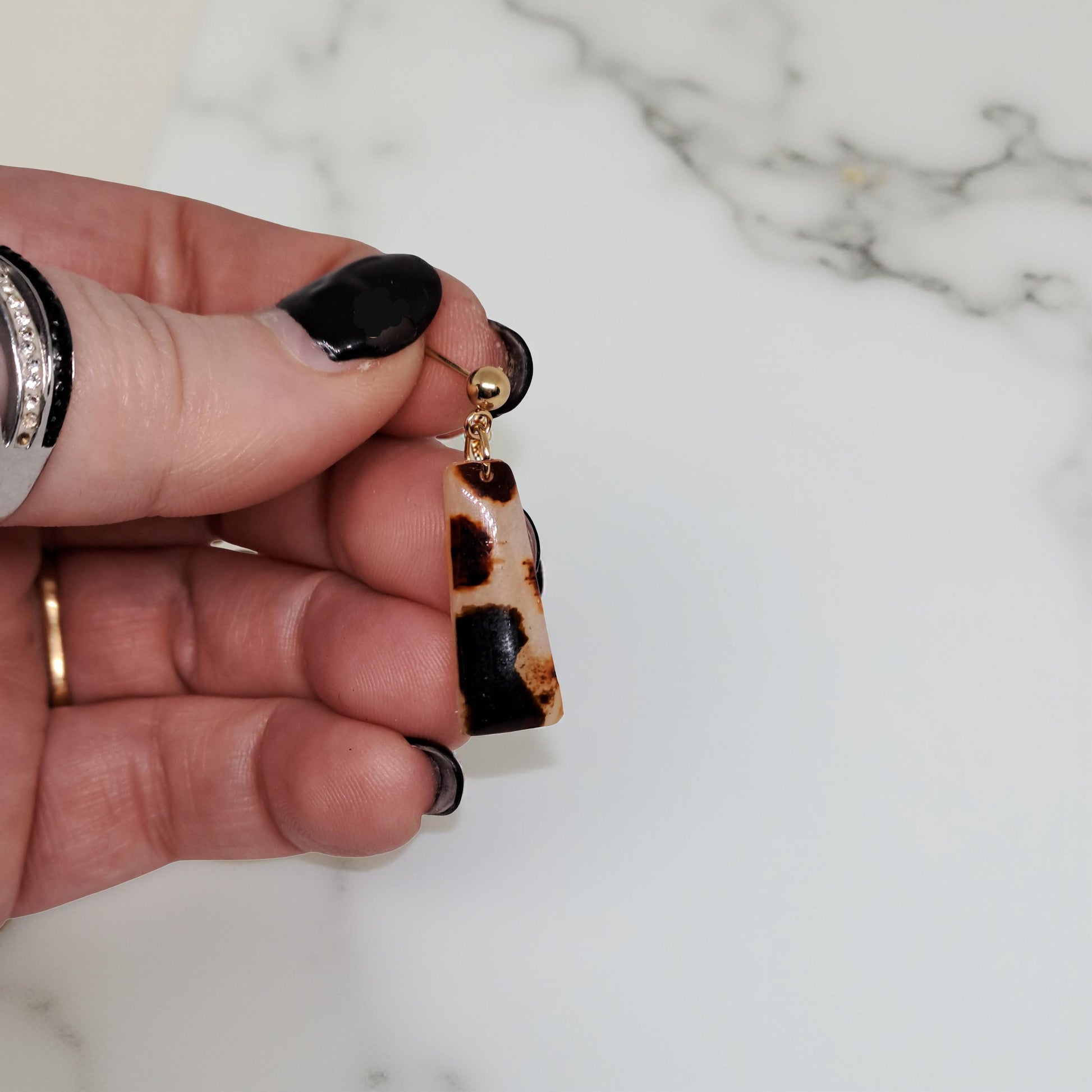 Des nuances naturelles qui dansent avec élégance… Les boucles d’oreilles Alba – Écaille douce marient le design graphique du trapèze à la douceur organique des tons ivoire, brun et noir. Chaque pendentif est façonné à la main, offrant un éclat subtil et unique pour un look raffiné et lumineux. Chaque paire est unique, les motifs varient d’une création à l’autre.