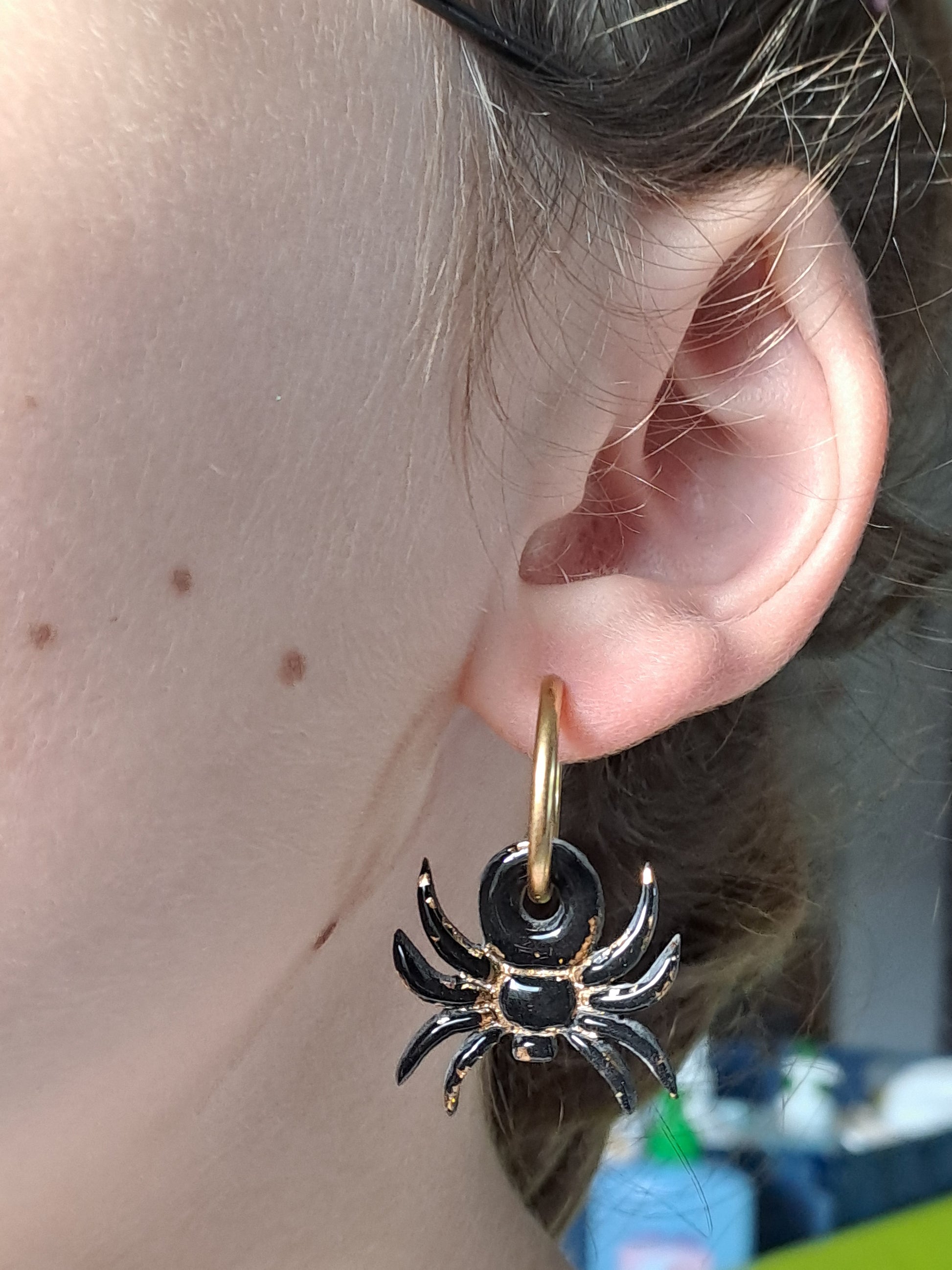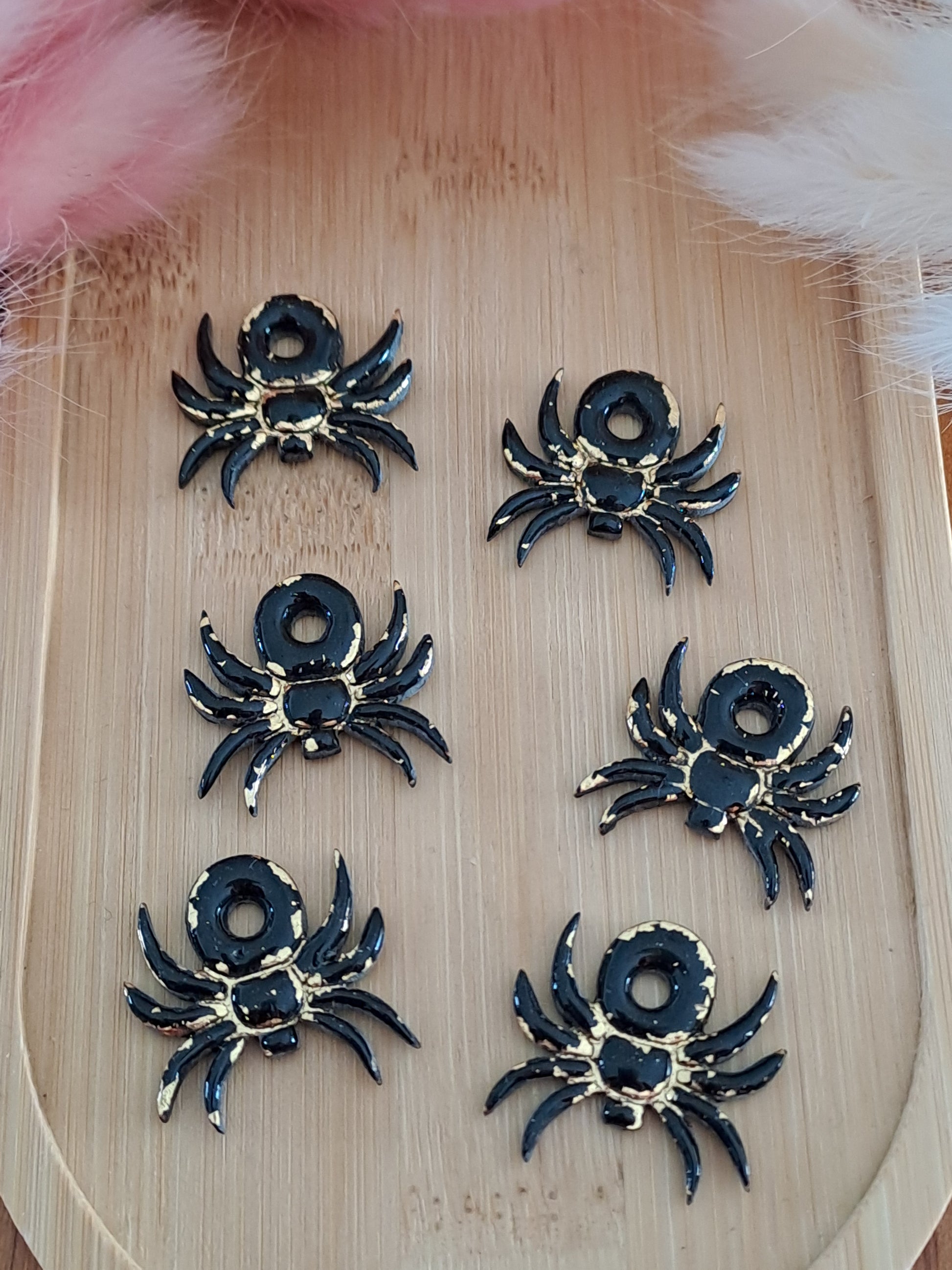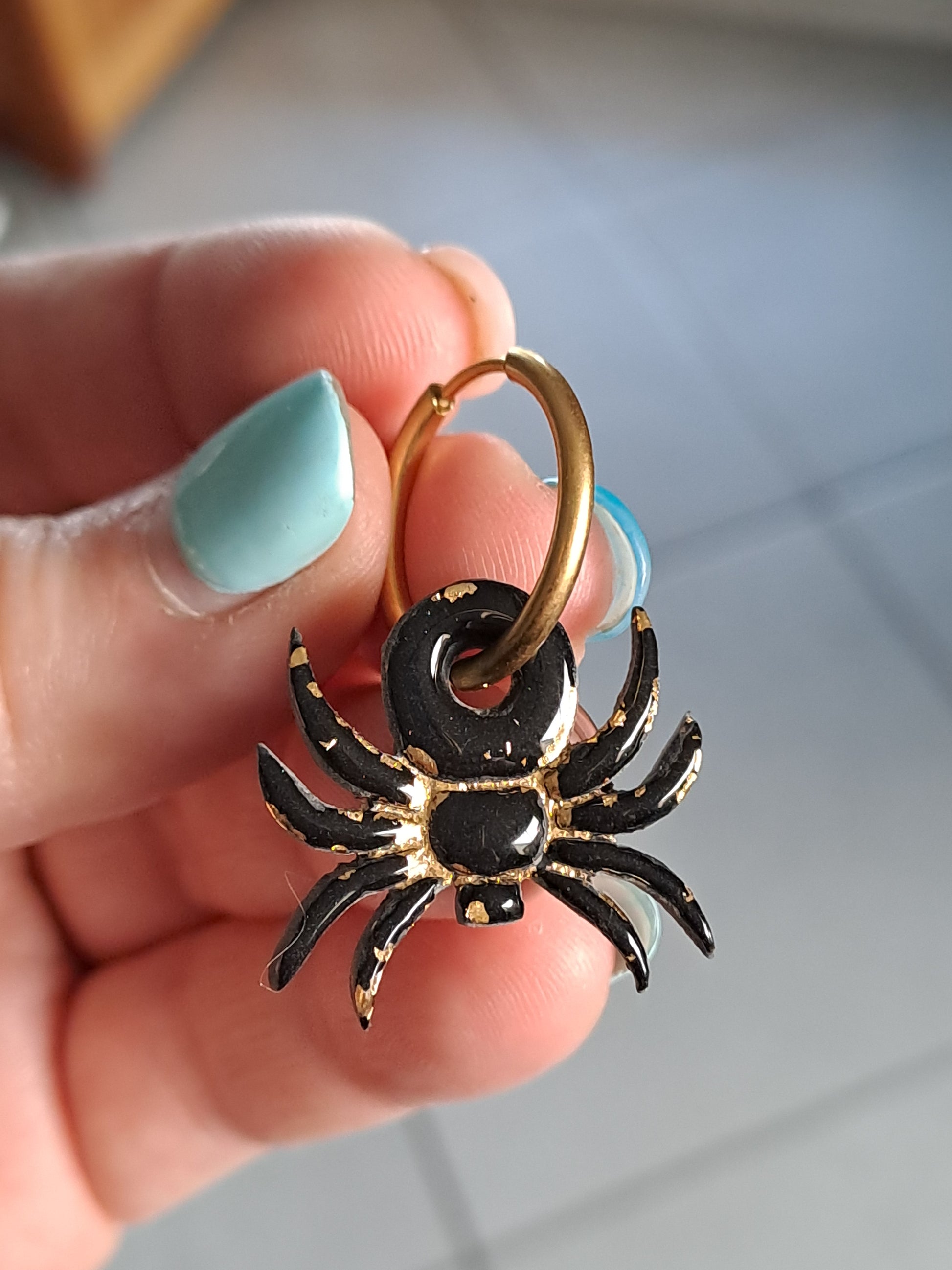 Mystérieuses et élégantes, les pampilles Araignées se distinguent par leur forme arachnéenne délicate, travaillée à la main avec soin. Leur finition en noir profond est sublimée par de fines touches dorées, qui captent la lumière et apportent un éclat raffiné à ce bijou original. Parfaites pour une touche audacieuse au quotidien ou pour compléter un look thématique 🎃✨