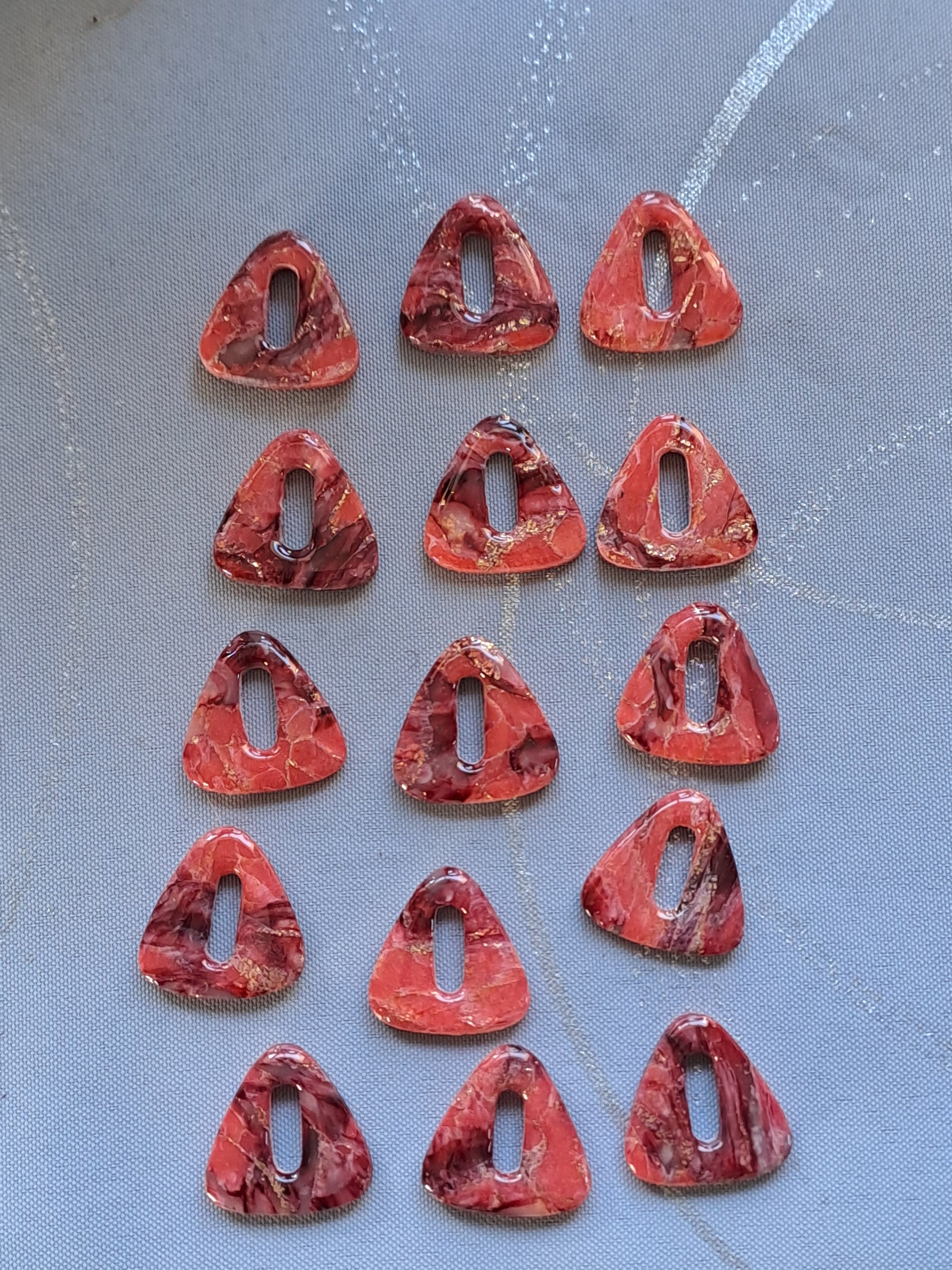 Chaque pièce est façonnée à la main en argile polymère, selon un mélange unique de pâtes transparentes teintées de rouge et de bordeaux, enrichies d’un soupçon de peinture blanche pour créer un effet marbré délicat.
