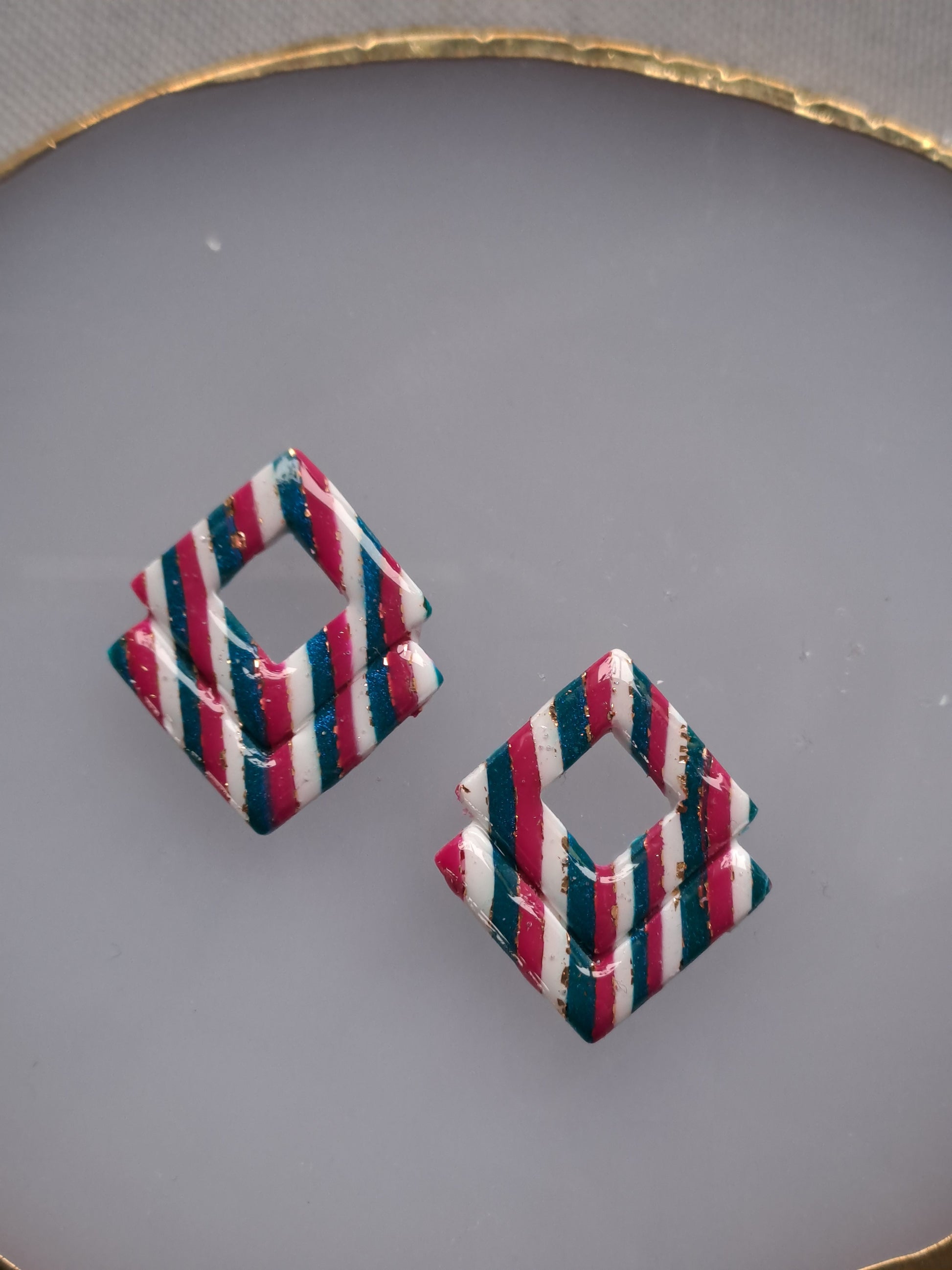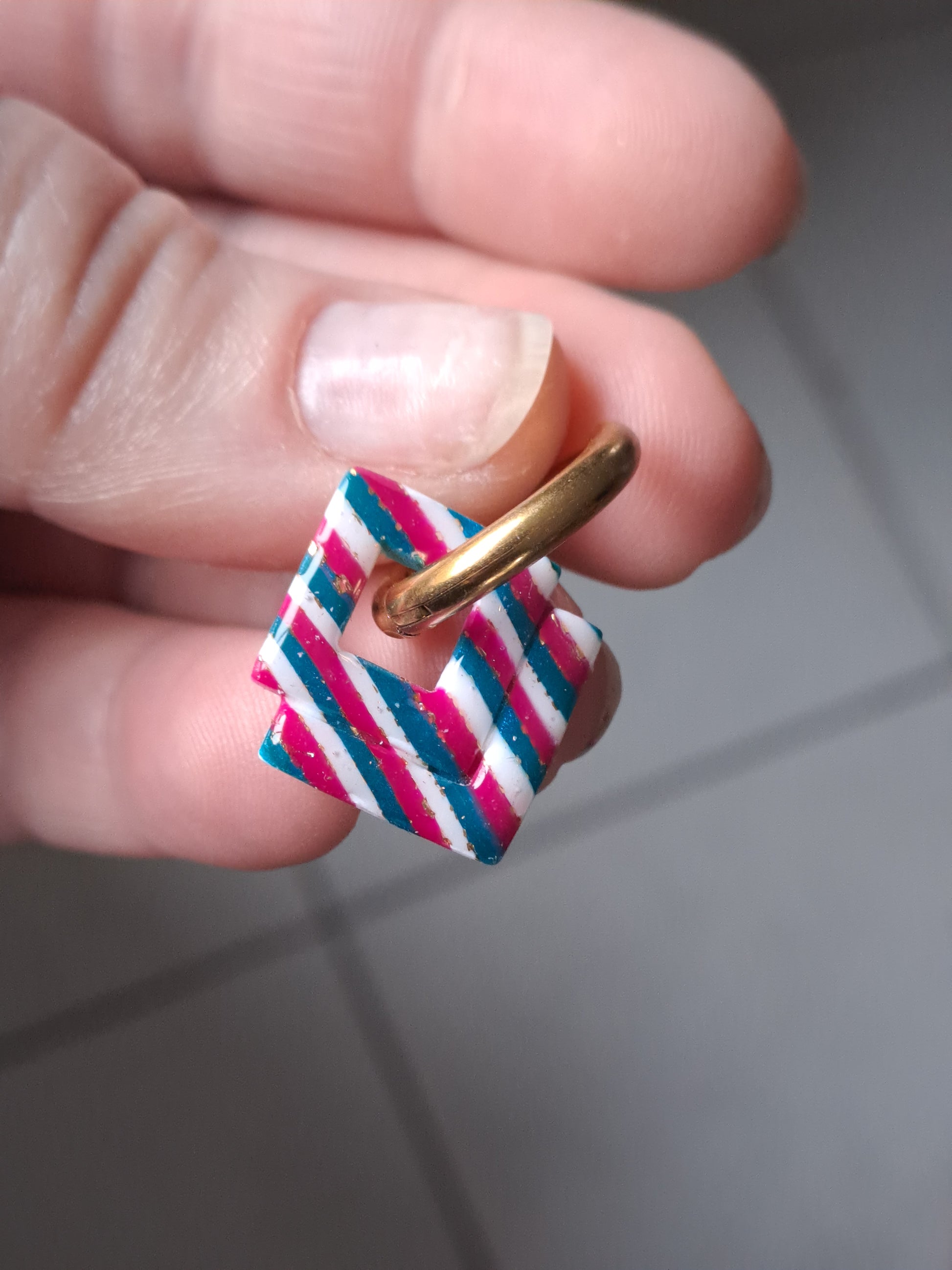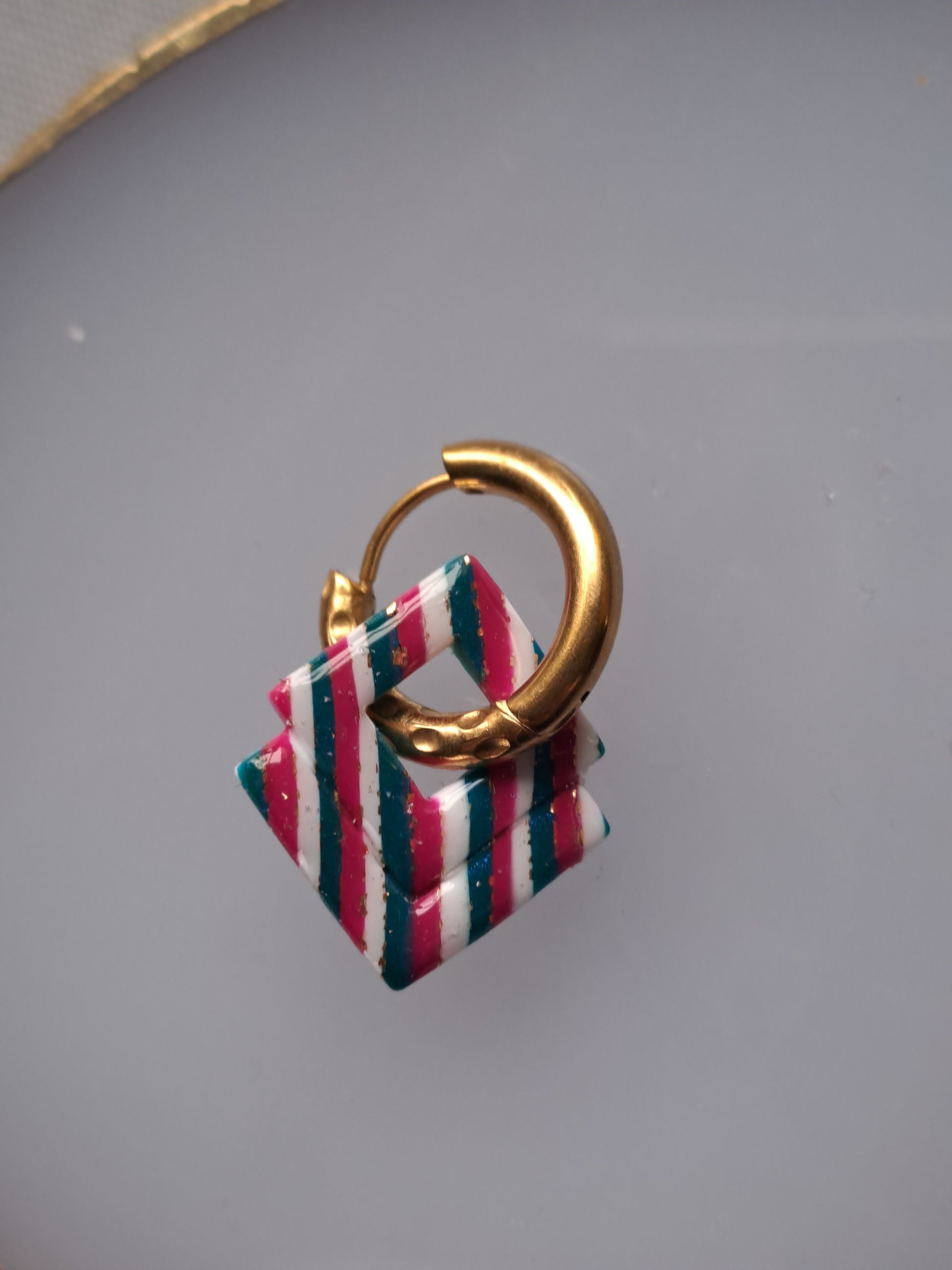 Façonnées à la main en argile polymère, chaque paire est unique : la disposition des rayures et des touches dorées varie légèrement selon la découpe.