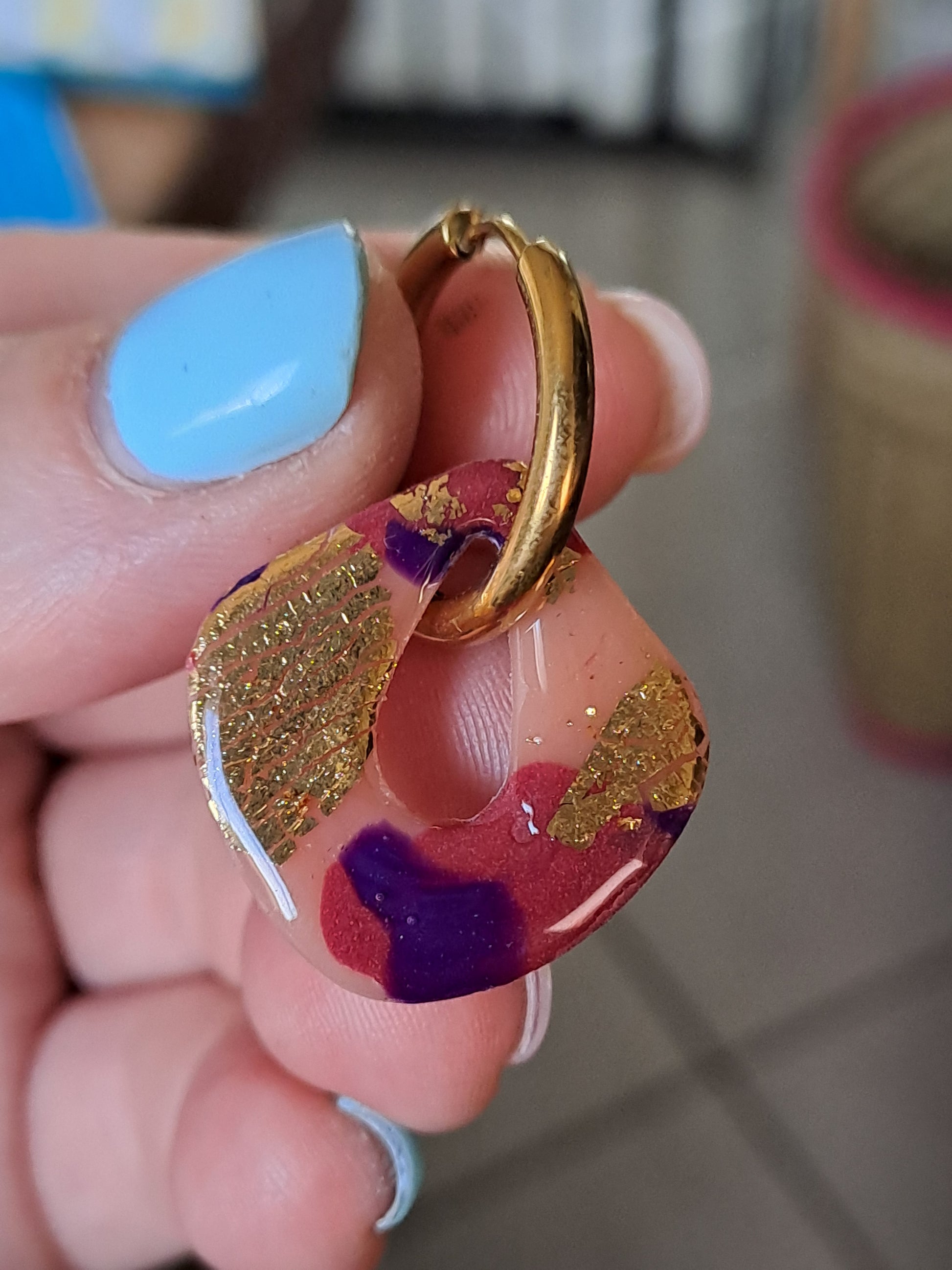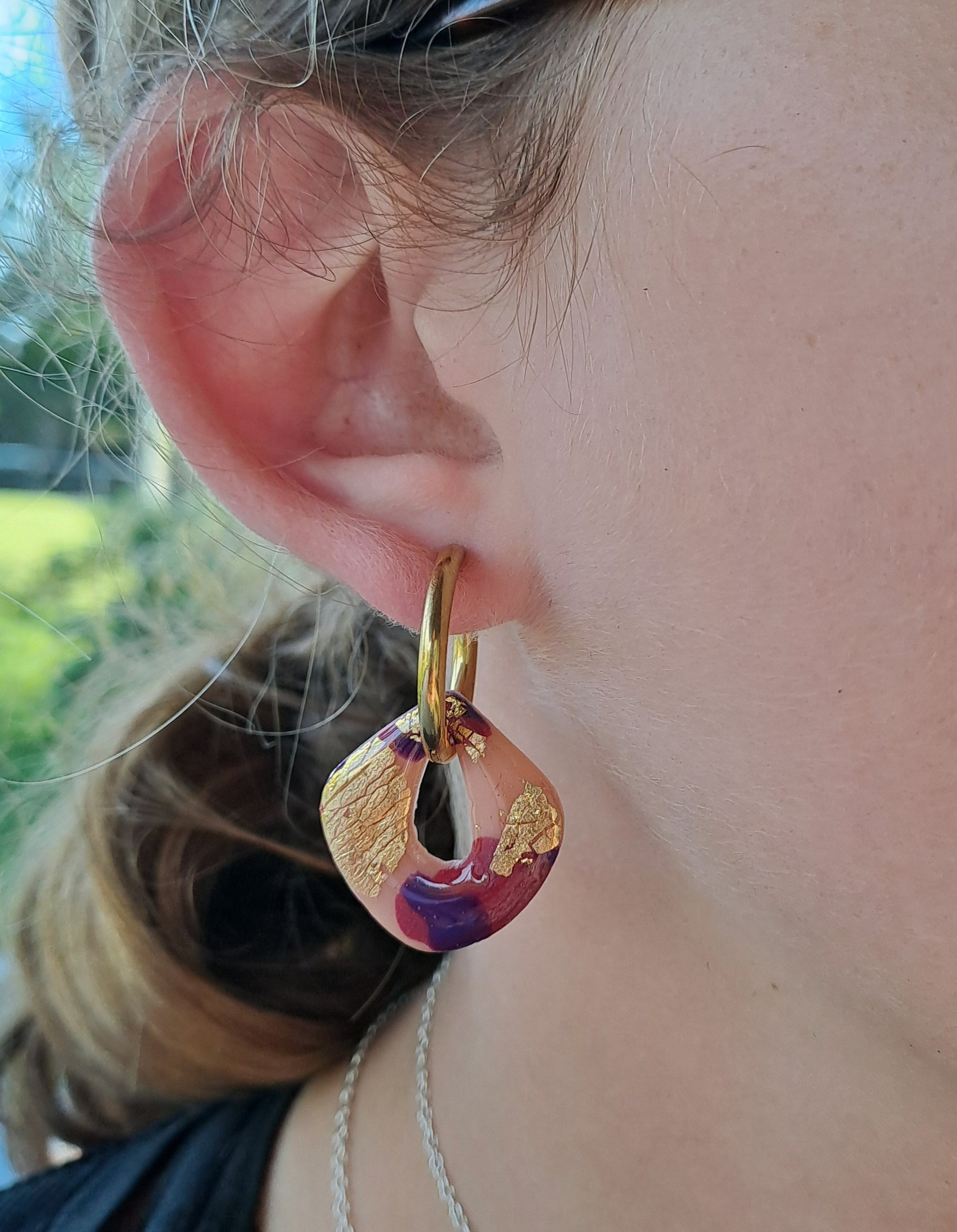 Le mélange de beige, cabernet et pourpre, relevé de touches d’or, crée un effet raffiné et lumineux qui sublime vos créoles interchangeables.