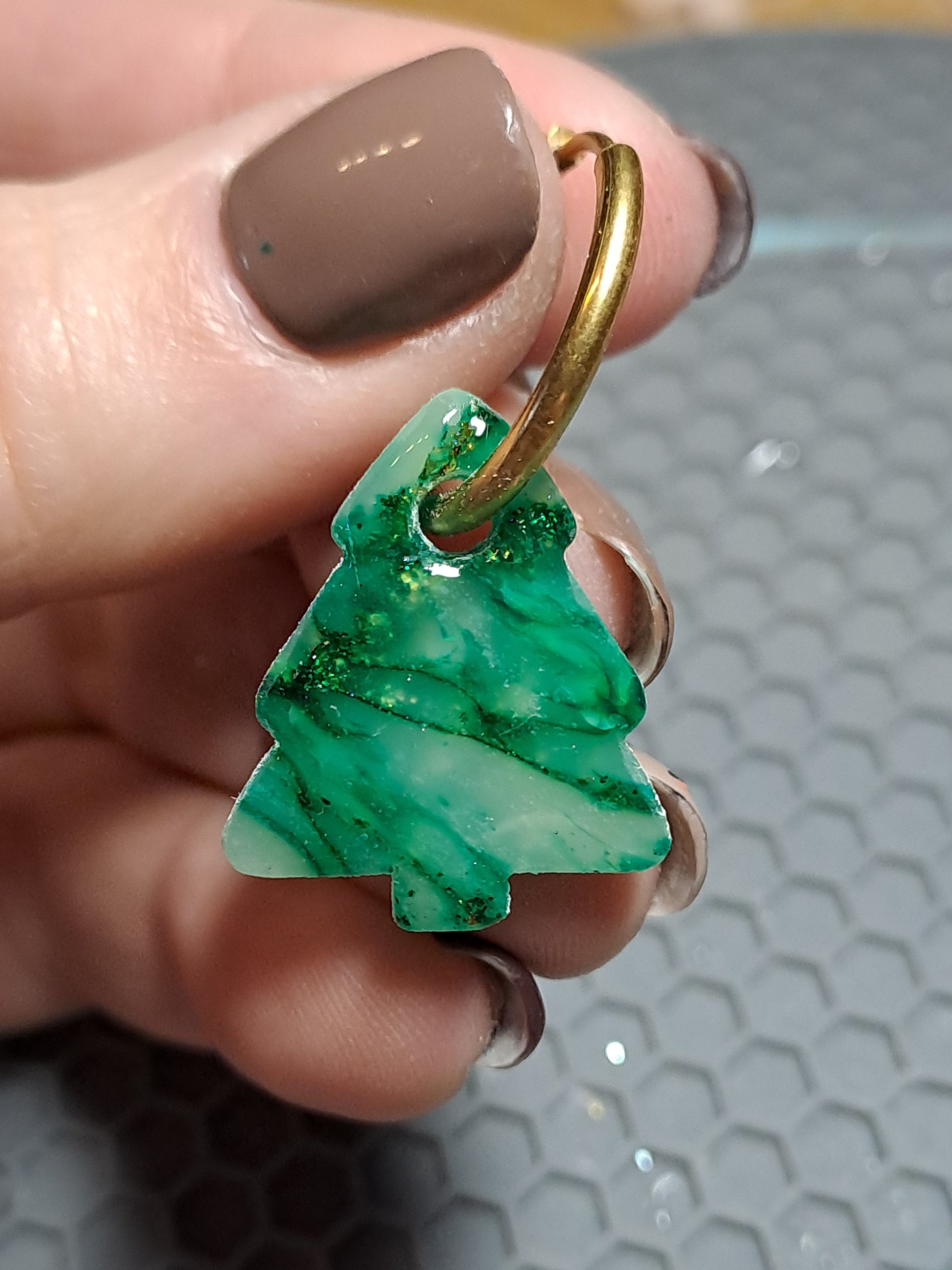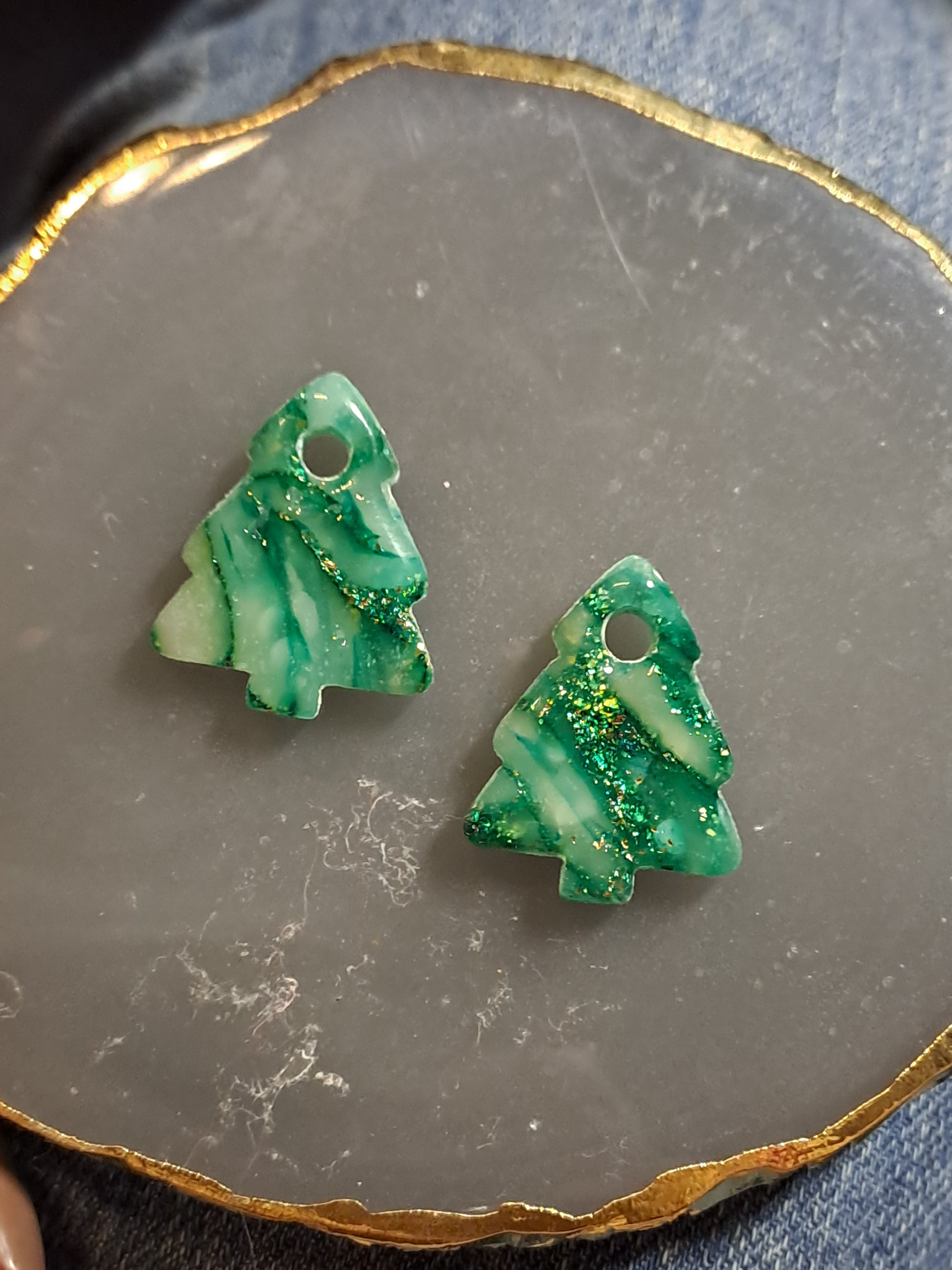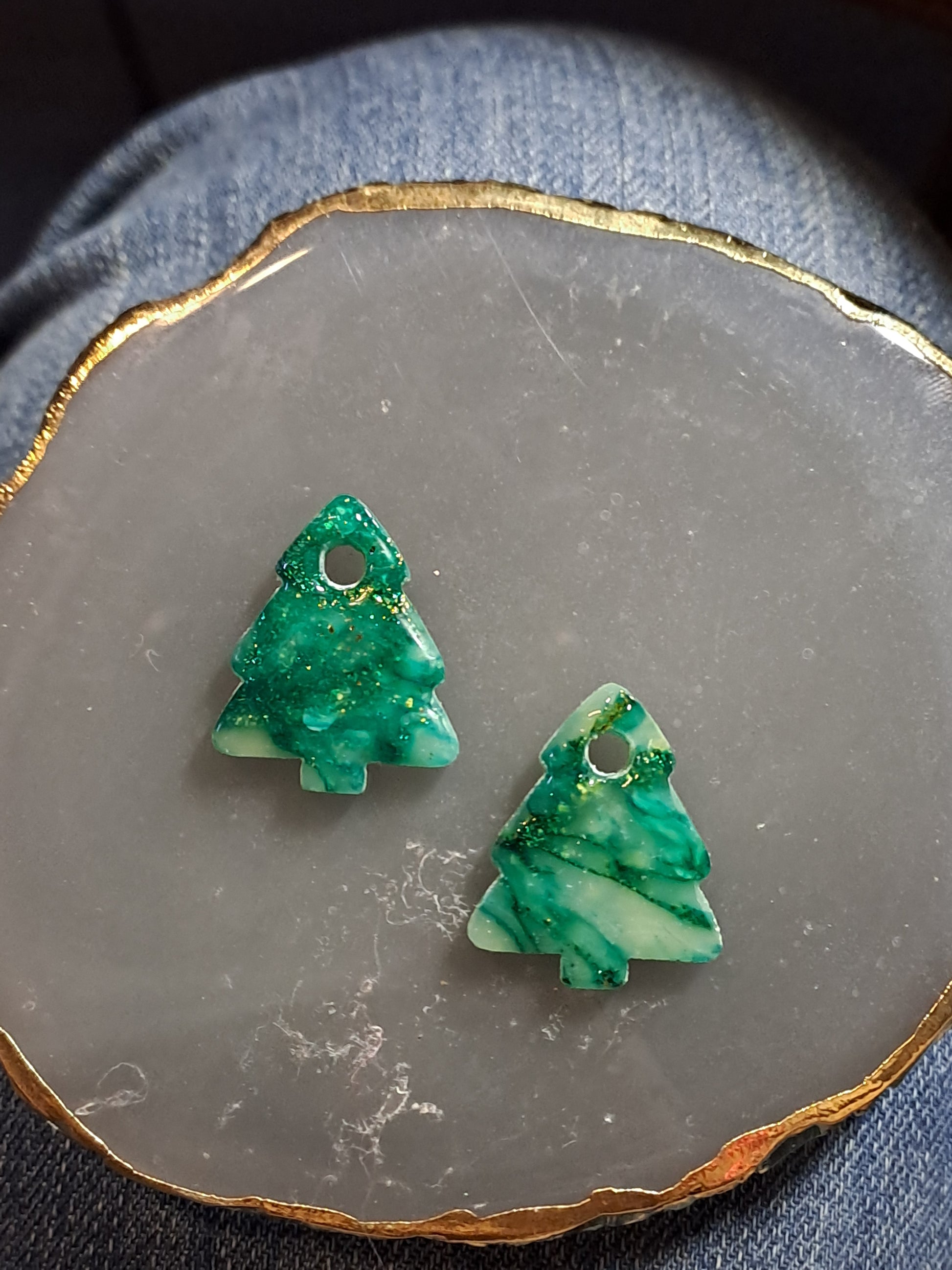 Évoquant la beauté d’un sapin givré sous les premières lueurs de Noël, les pampilles Sapin Cristal d’Or mêlent la transparence délicate de l’argile polymère à des nuances d’émeraude lumineuse et à des éclats de feuille d’or.