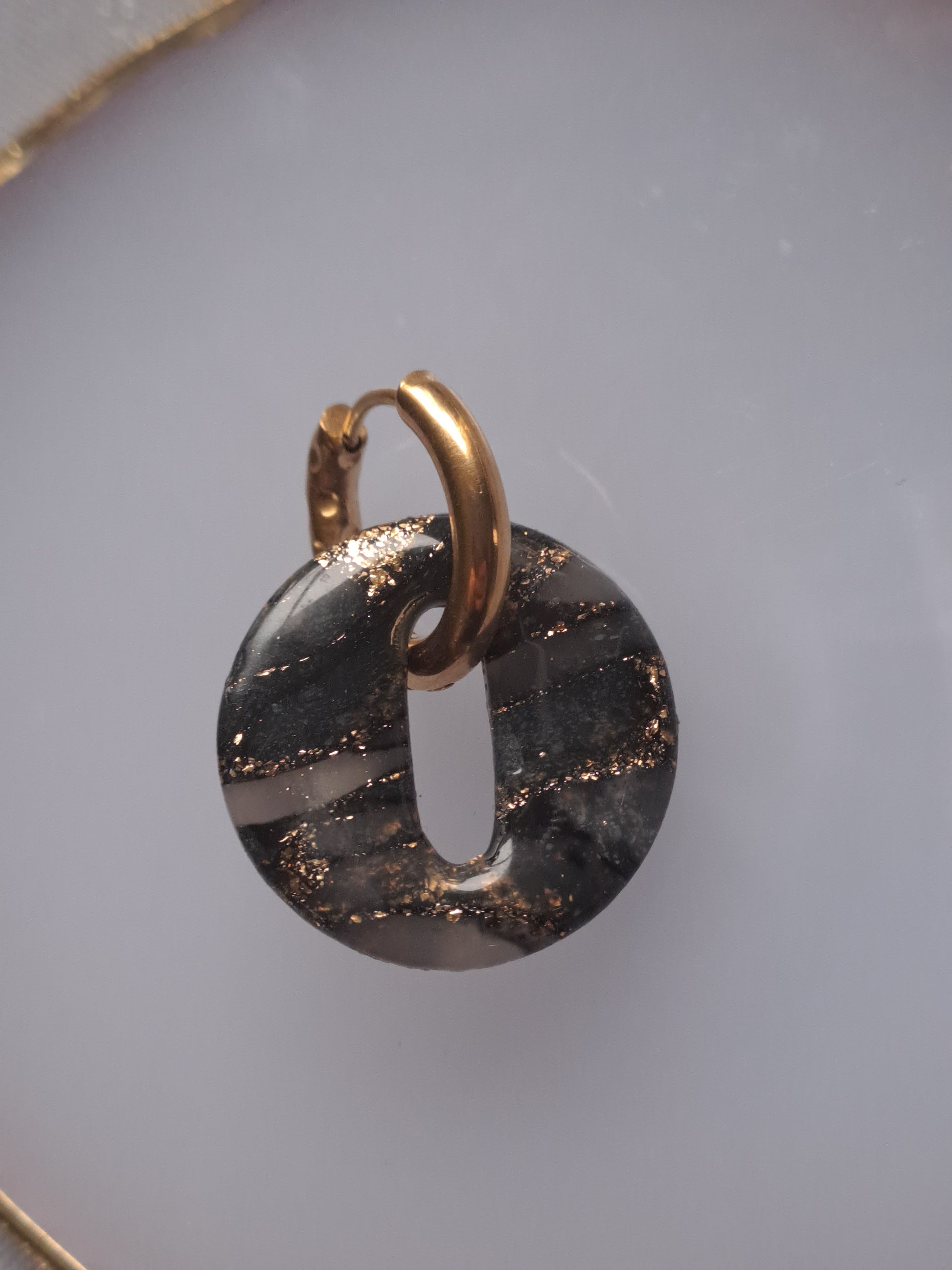 Réalisées en argile polymère translucide, elles sont travaillées avec de l’encre d’alcool noire puis délicatement rehaussées de feuilles d’or, créant des marbrures uniques et profondes.